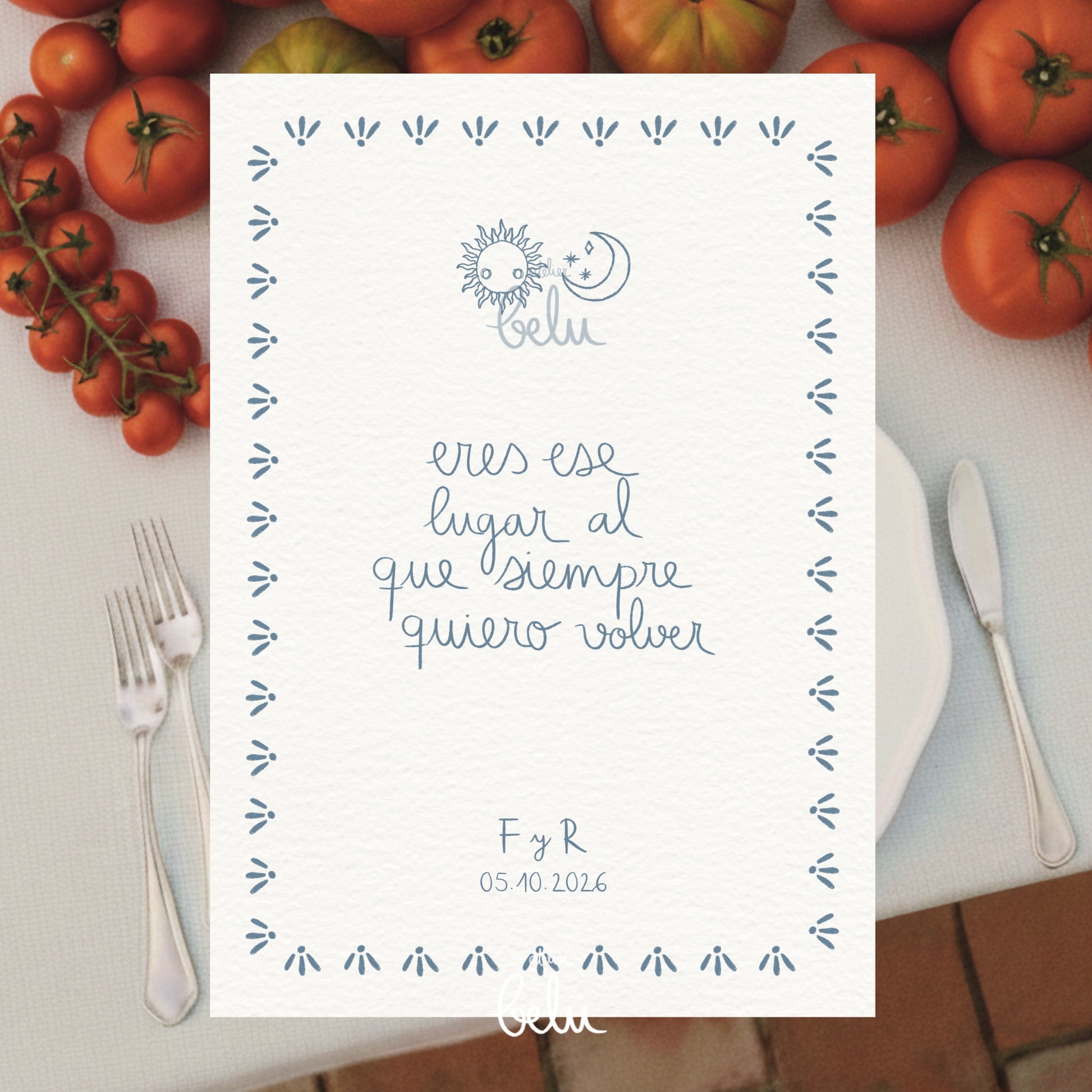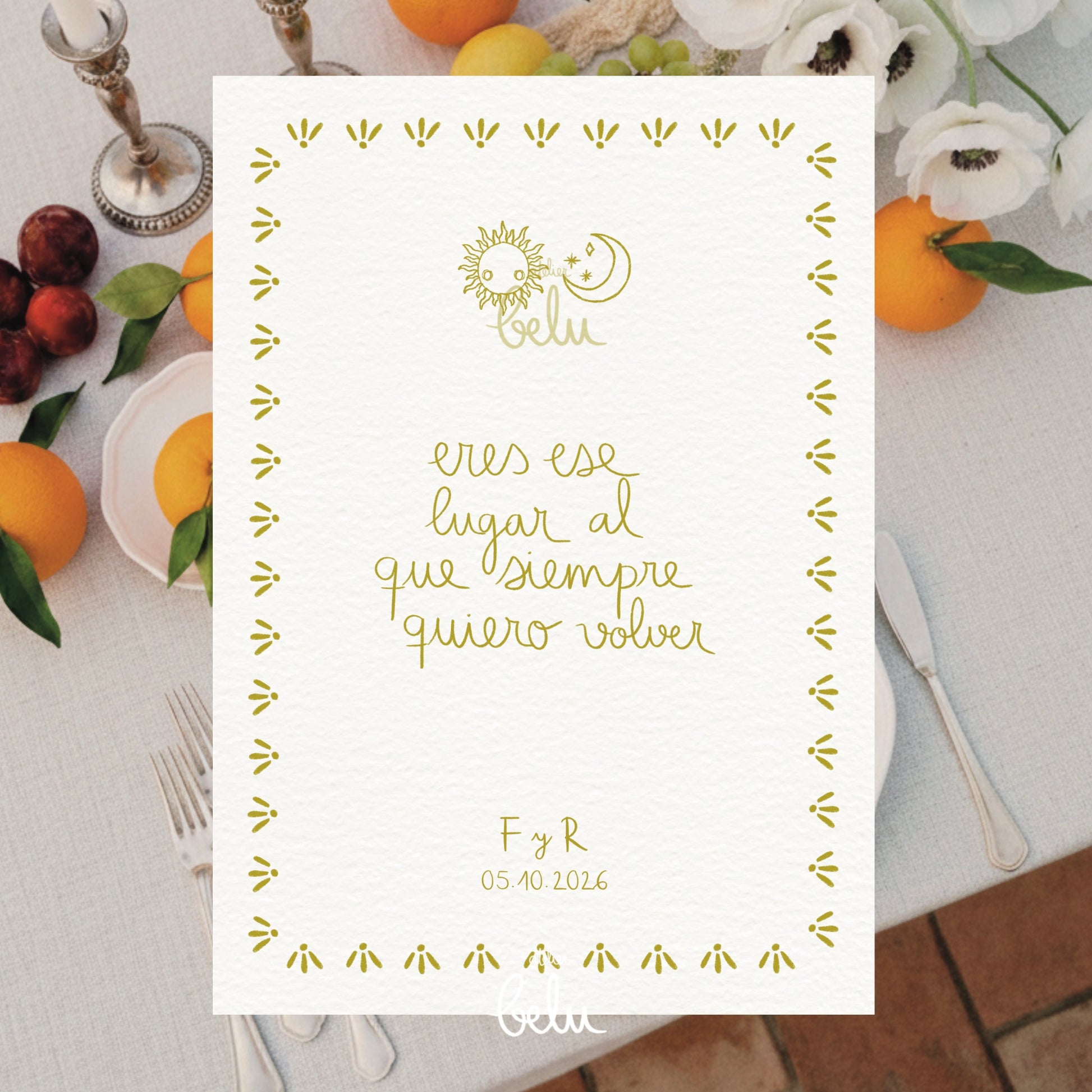 El diseño es exactamente como se muestra en las imágenes. Podéis personalizarlo con vuestra frase, iniciales y la fecha.